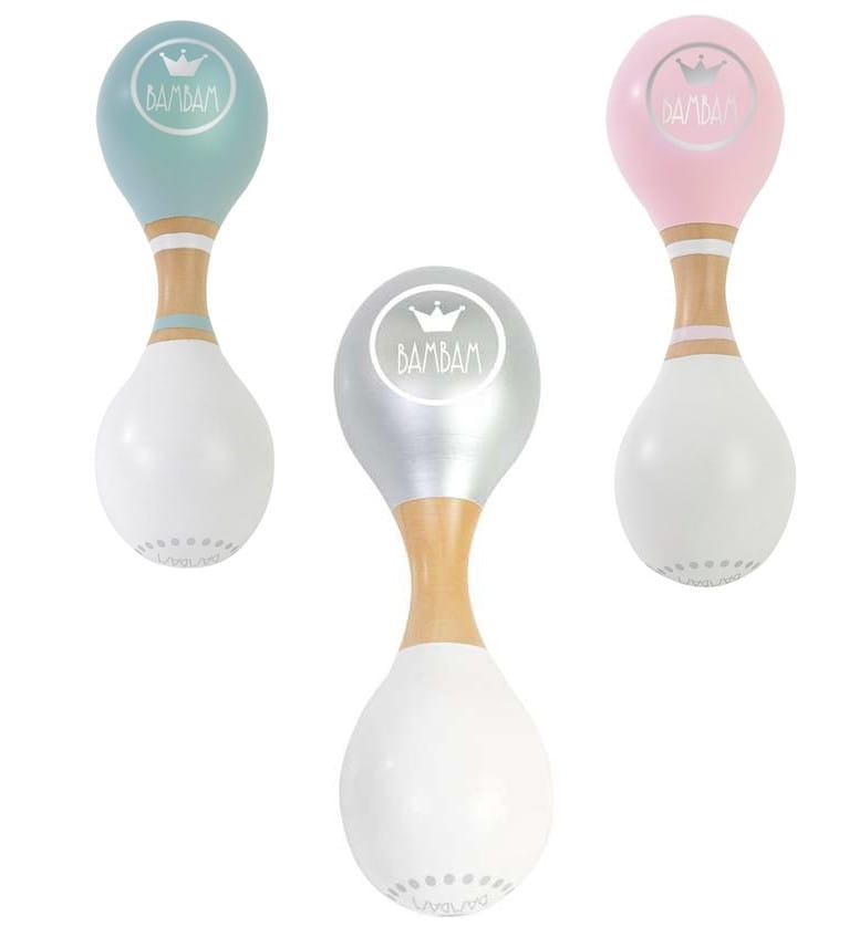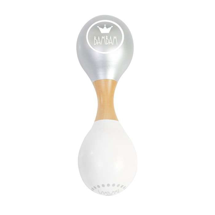 Bambam Grzechotka drewniana marakas, biało srebrna