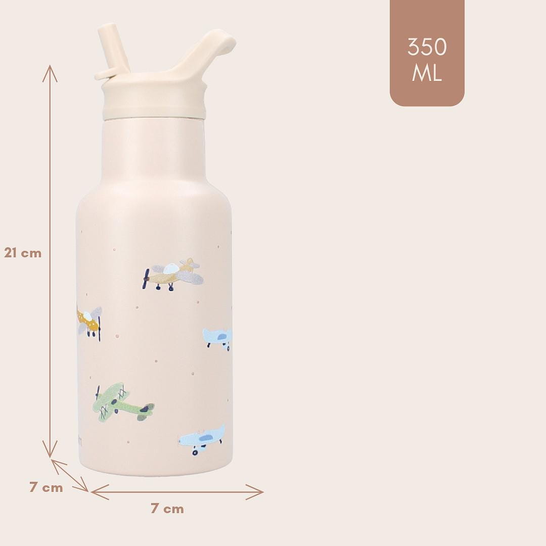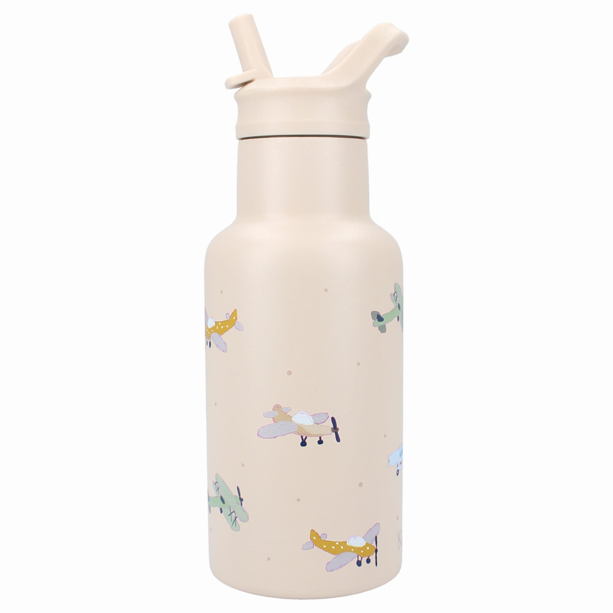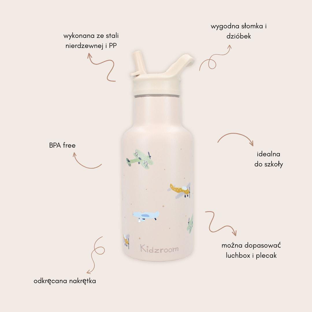 Zadbaj o nawodnienie swojego dziecka w pięknym stylu dzięki butelce holenderskiej marki Kidzroom.Ten beżowy bidon ze stali nierdzewnej z wzorem w kolorowe samoloty to idealny towarzysz przedszkolaka i ucznia – w szkole, na spacerze czy w podróży. Poręczny rozmiar i pojemność 350 ml sprawiają, że dziecko z łatwością mieści ją w plecaku i wygodnie korzysta bez pomocy dorosłych.