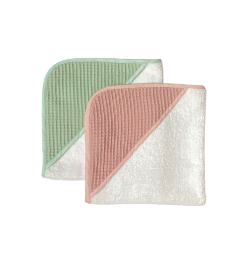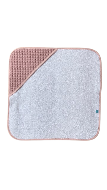 Okrycie kąpielowe zostało uszyte z białej bawełny oraz posiada kapturek z materiału wafelek w kolorze różowym. Obszyty jest bawełnianą lamówką w kolorze różowym.