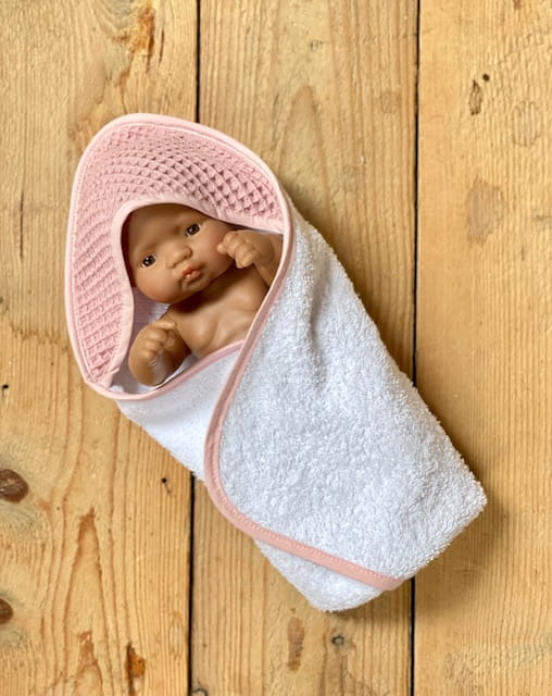Cookids, Ręcznik z kapturkiem dla lalki Miniland 32 cm okrycie kąpielowe, biały z różowym wafelkiem