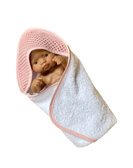 Ręcznik kąpielowy dla lalki Miniland 32 cm z kapturkiem z wafelka w kolorze różowym.