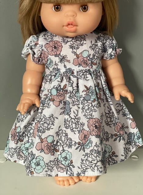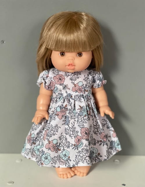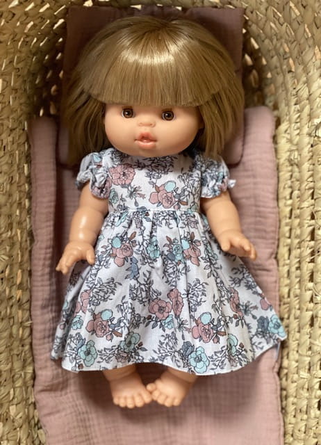 Sukienka muślinowa dla lalki Paola Reina, Minikane 34 cm w kwiatki.