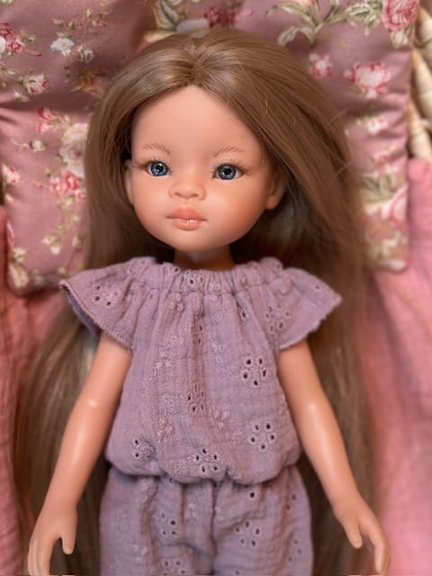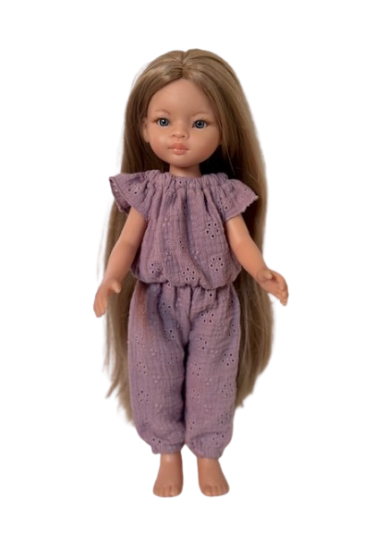 Śliczny kombinezon dla lalki Paola Reina 32 cm Amigas z haftowanego muślinu w kolorze fioletowym.