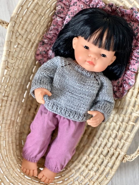 Dziergany sweterek z włóczki dla lalki Miniland 38 cm.
