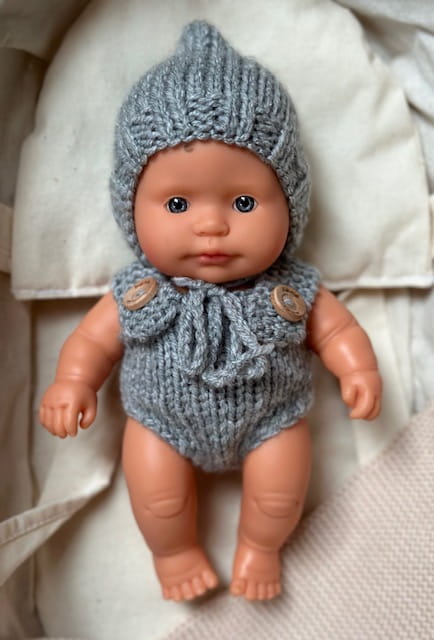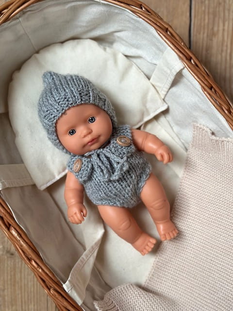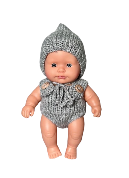Cookids Ubranko dla lalki Miniland 21 cm z włóczki, body i czapka szare