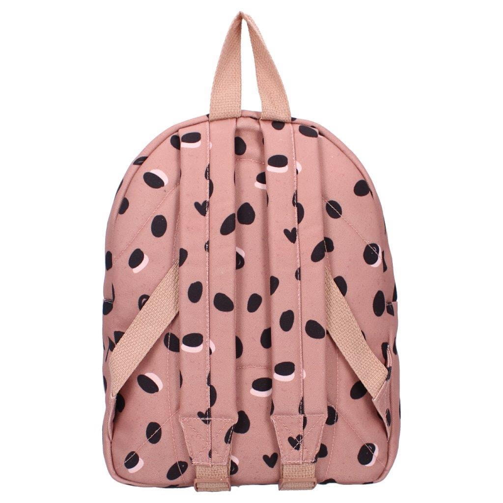Plecak w odcieniu jasnego brązu z uroczymi nadrukami na całej powierzchni i małym brokatowym serdeszkiem, wykonany jest z miękkich materiałów jakie pochodzą z poliestru z recyklingu (rPET) i wyprodukowany w Europie.