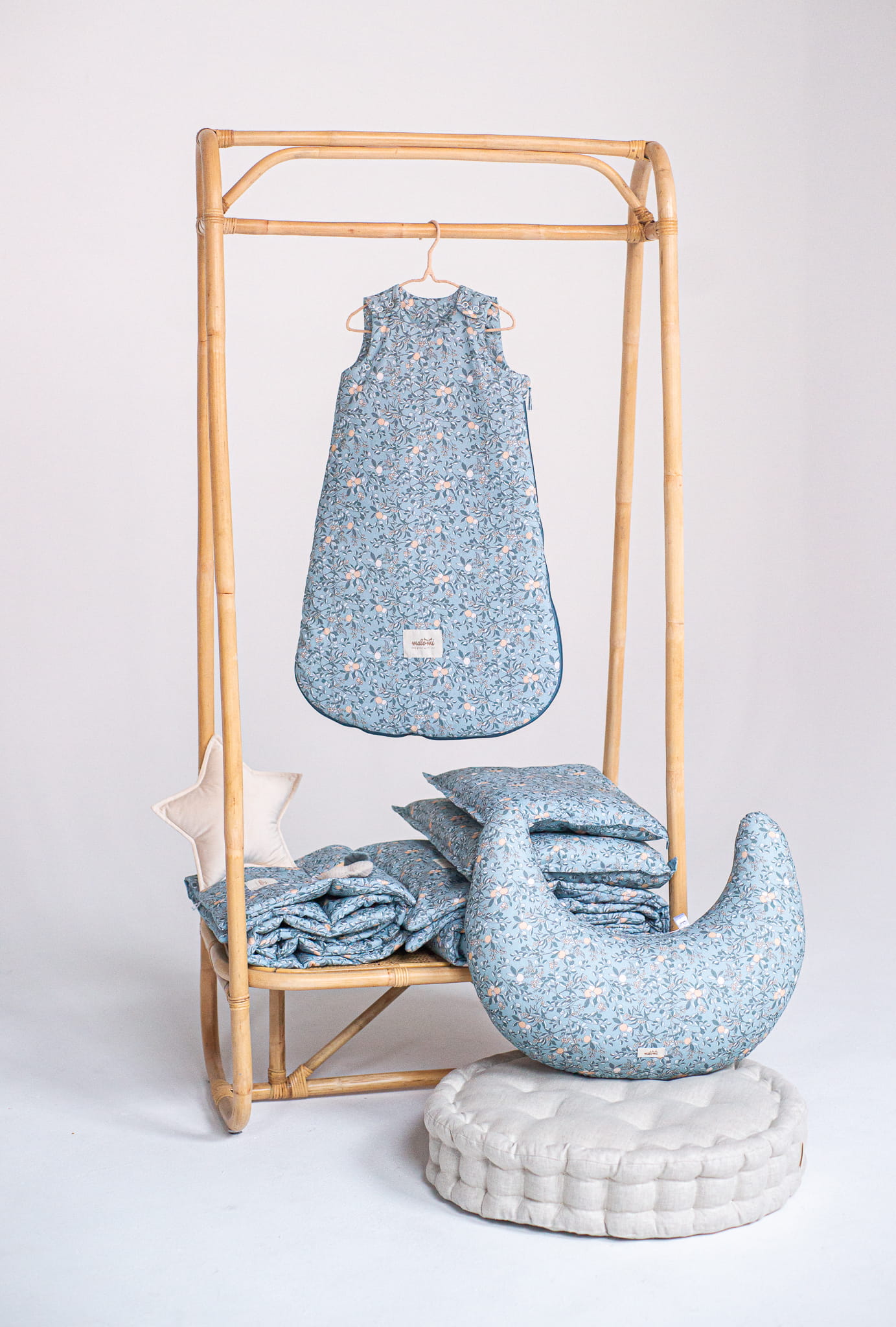 Praktyczny śpiworek wykonany z drukowanej bawełny.