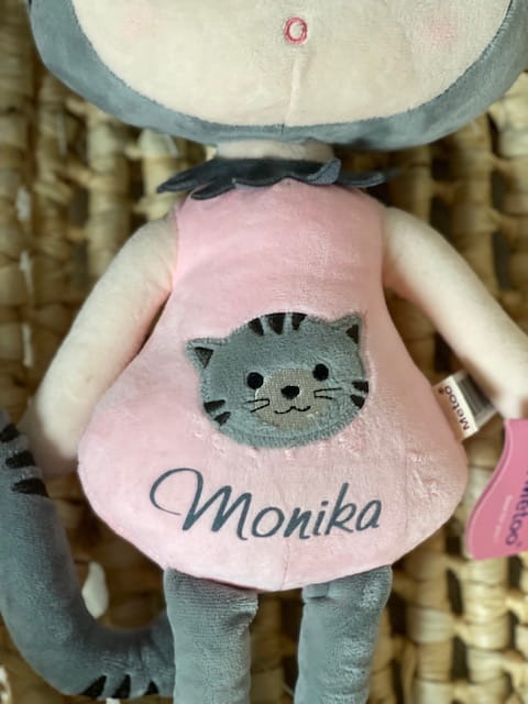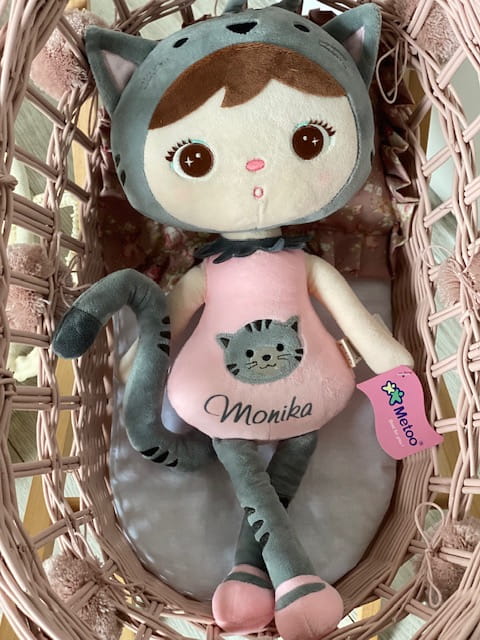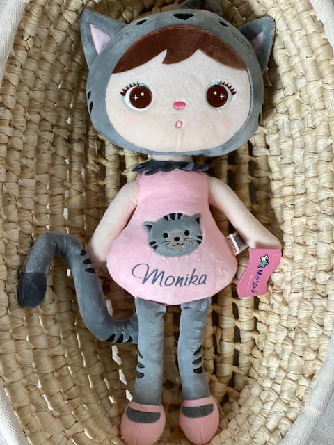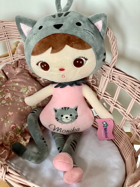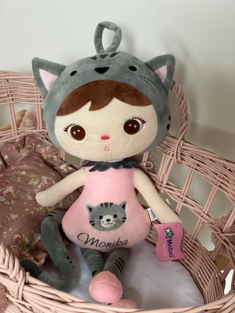 Urocza lalka, bardzo ładnie wykonana z gotowym imieniem Monika w kolorze szarym - nie ma możliwości wyboru imienia.Wielbicielki kotków będą nią zachwycone.