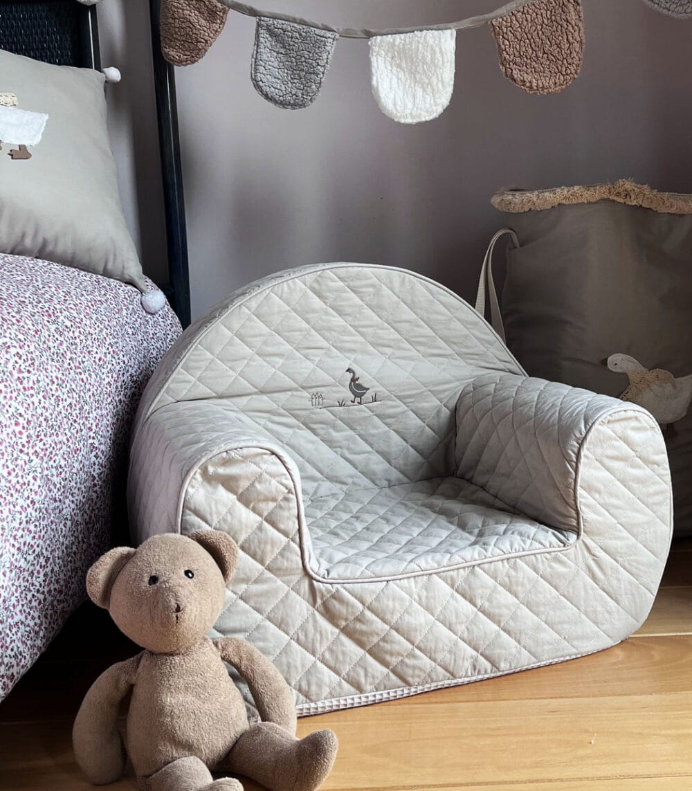 Fotelik pikowany dla dziecka z haftowaną Gąską marki Muzpony.