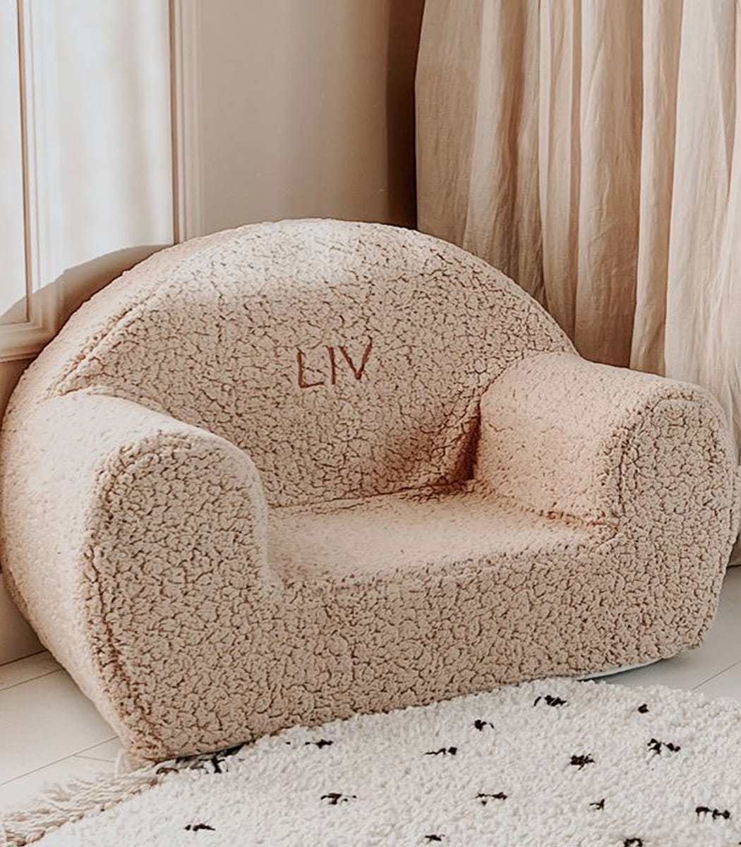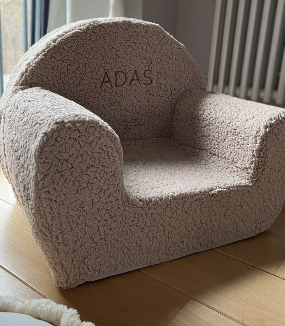 Muzpony Futrzany fotelik dla dziecka z haftowanym imieniem beżowy
