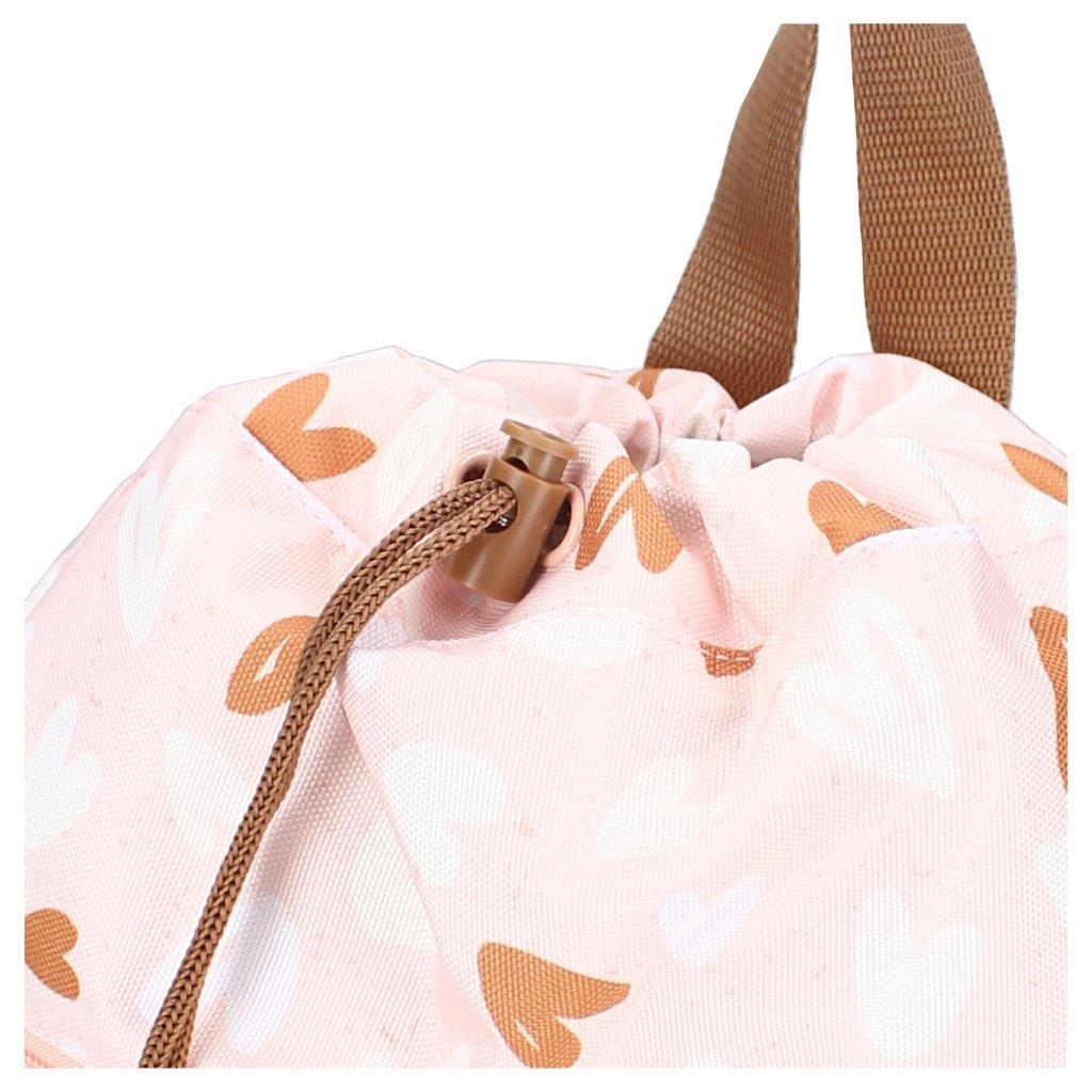 Jest wykonany z miękkiego materiału z recyklingu w kolorze vanilli z różem i ma nadruk słodkich serduszek.