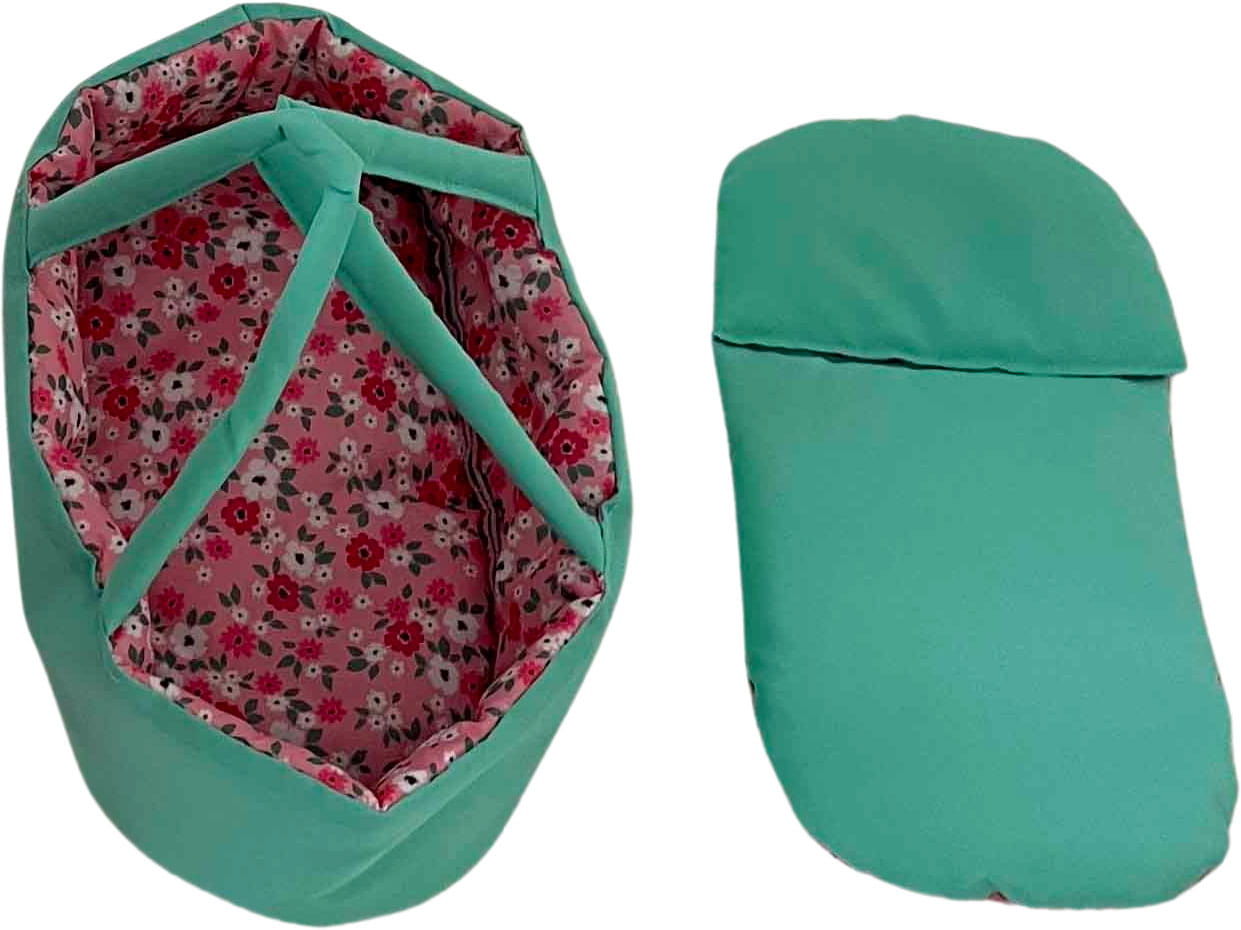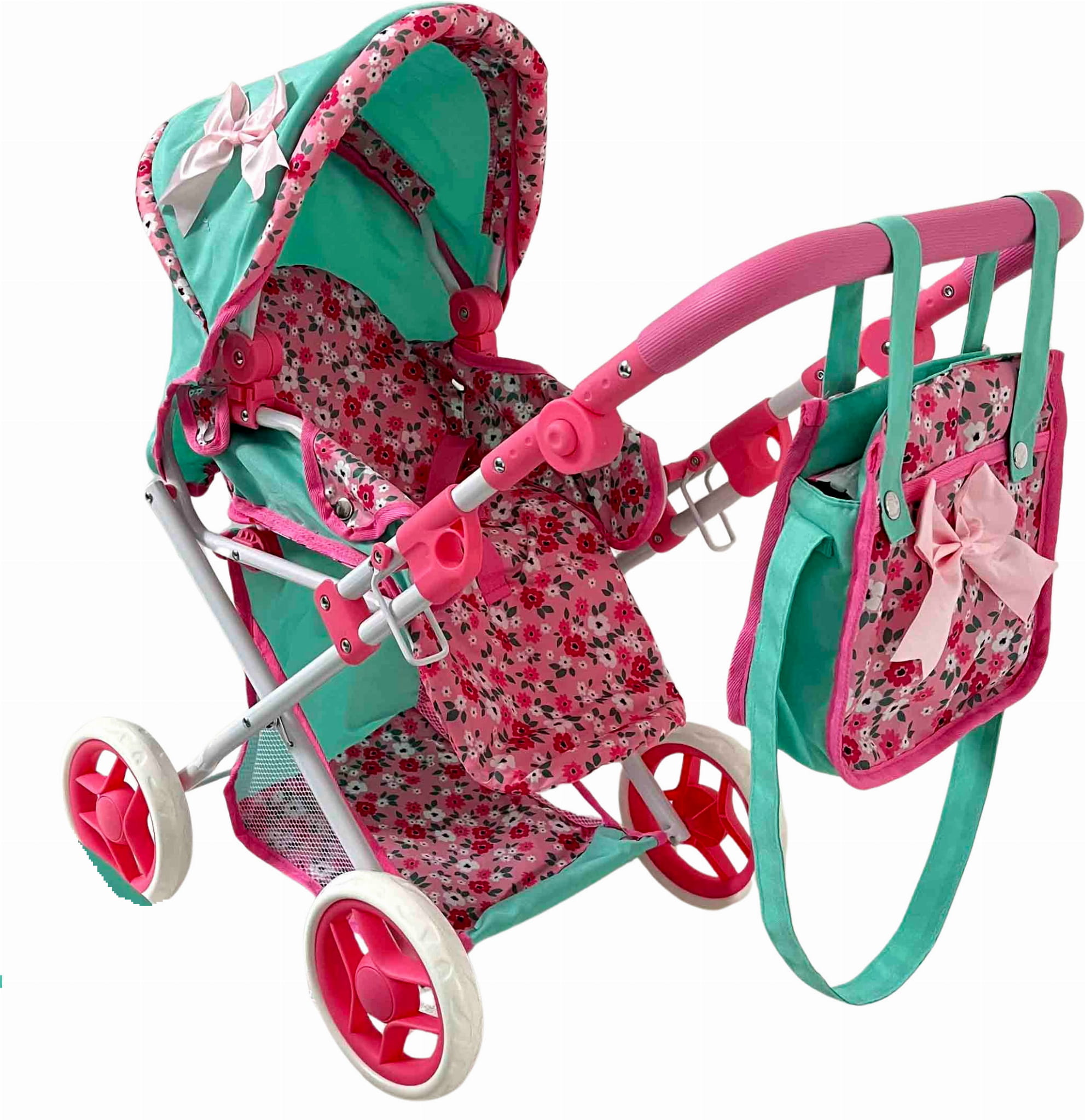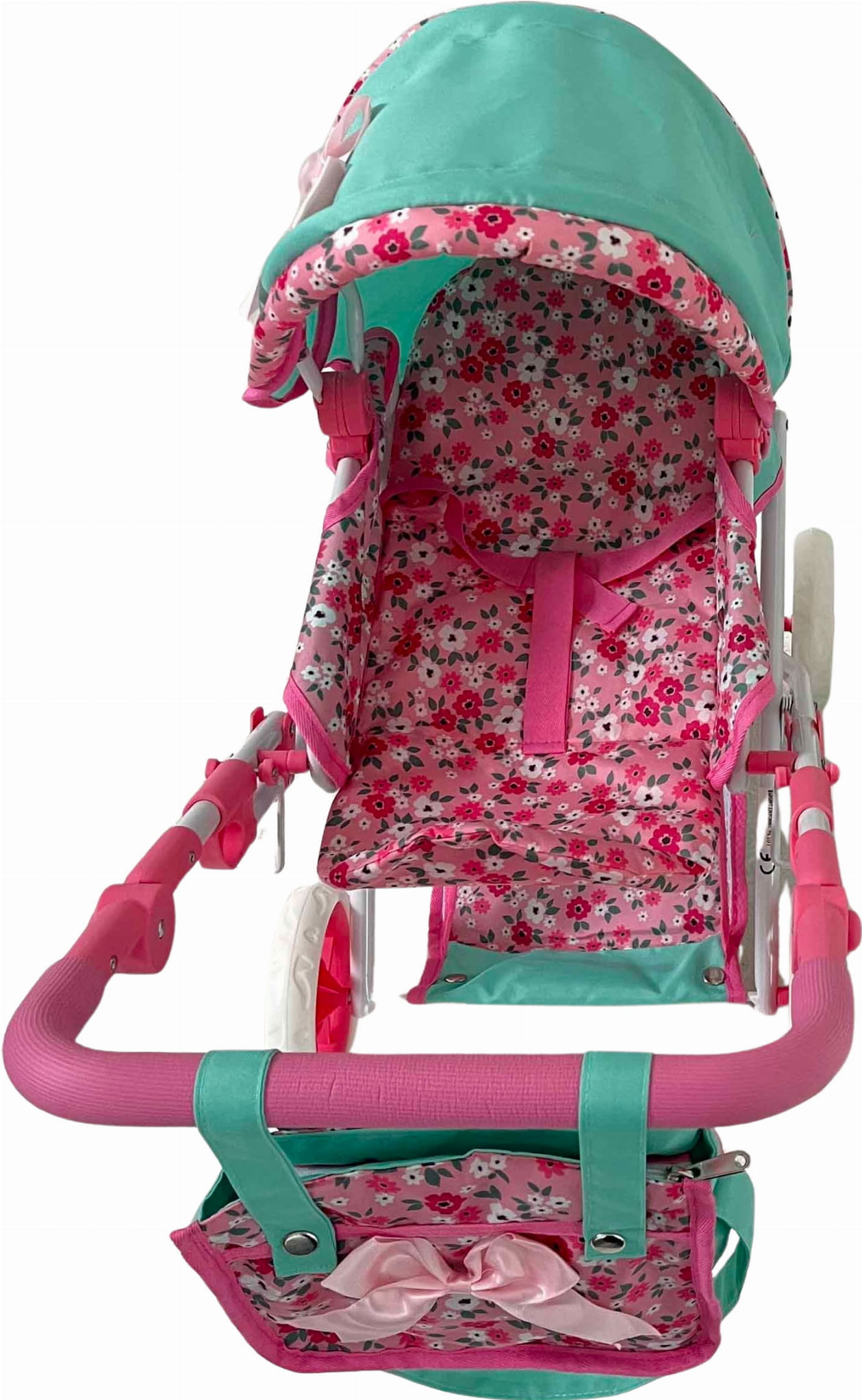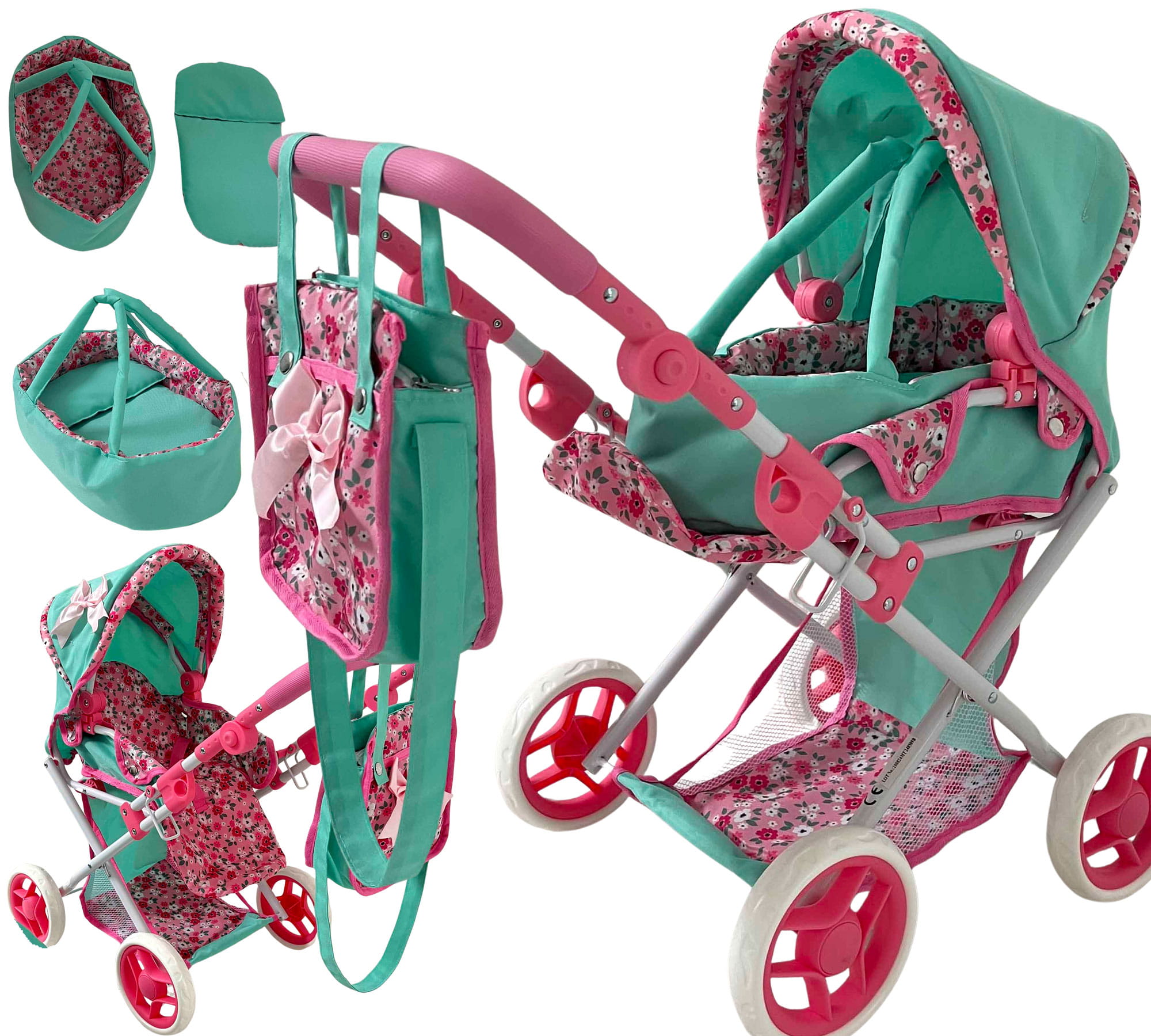 Wózek wielofunkcyjny dla lalek turkusowy w różowe kwiatki Mariotoys