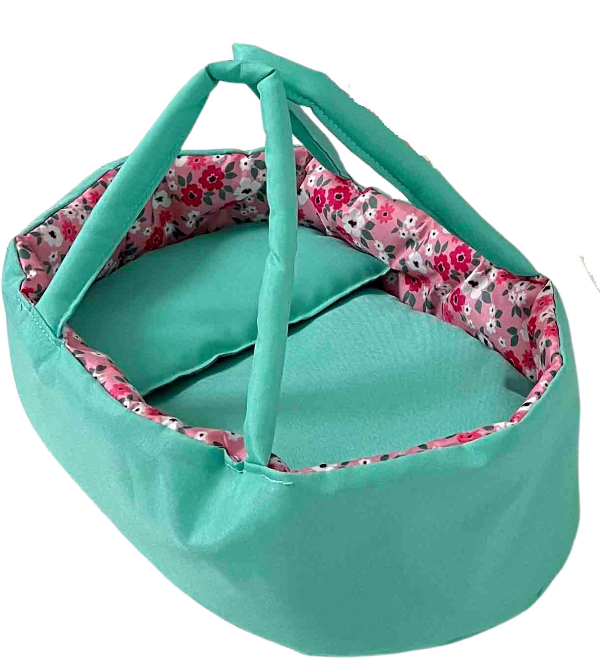 Wózek wielofunkcyjny głęboki i spacerowy z torbą w kolorze turkusowym z różowymi kwiatuszkami.